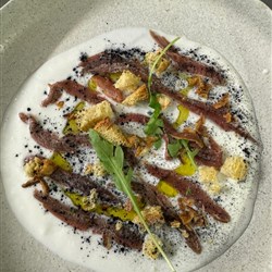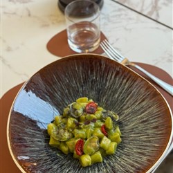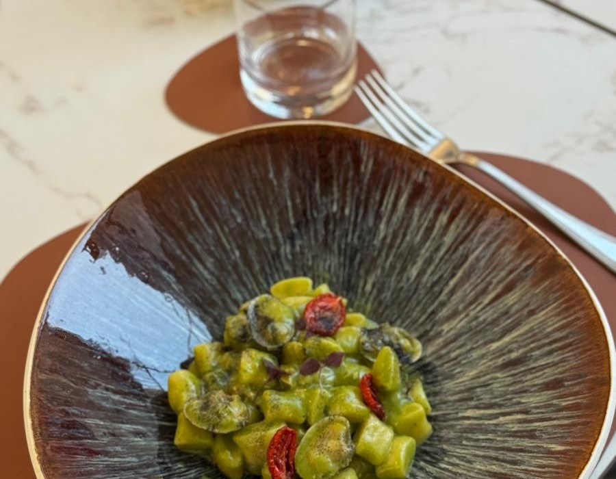 La filosofia del ristorante si fonda sulla qualità e sulla semplicità: anche nei piatti più elaborati, così come nelle pizze serali, il principio del “less is more” guida la cucina, valorizzando materie prime di eccellenza e lavorazioni essenziali.